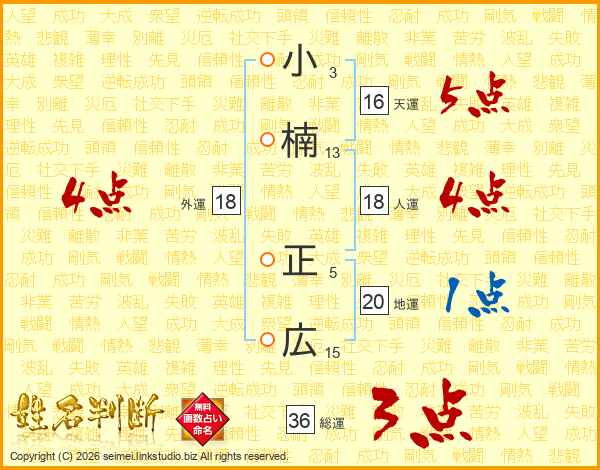 小(3画)楠(13画) 正(5画)広(15画)