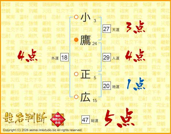 生活面を象徴する運勢です。外部から受ける影響力を表し、結婚運、家庭運や職場、環境への順応性を表します。総運から人運を引いた画数。姓や名が1文字の場合を除く。