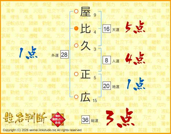 屋(9画)比(4画)久(3画) 正(5画)広(15画)