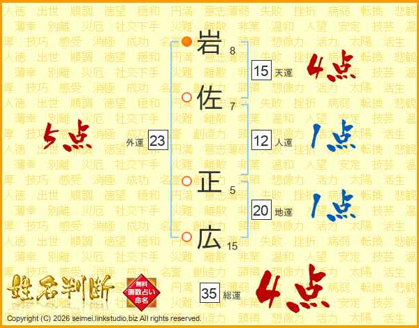 岩(8画)佐(7画) 正(5画)広(15画)