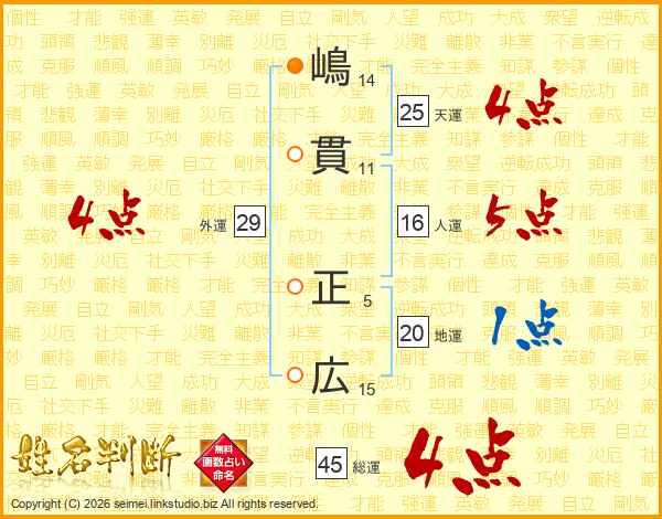 嶋(14画)貫(11画) 正(5画)広(15画)