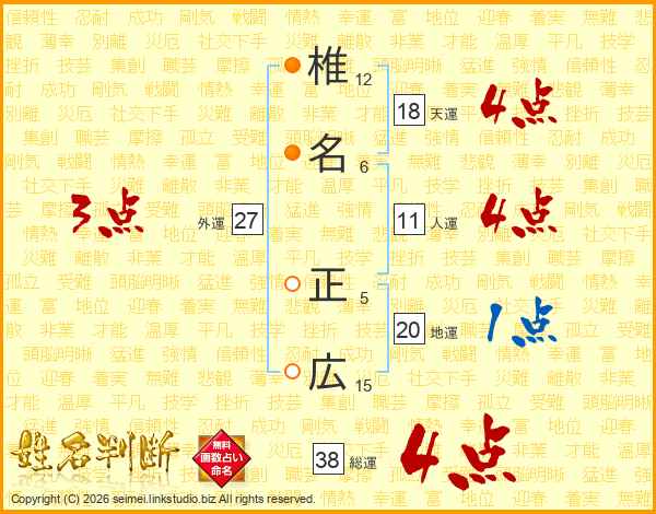 生活面を象徴する運勢です。外部から受ける影響力を表し、結婚運、家庭運や職場、環境への順応性を表します。総運から人運を引いた画数。姓や名が1文字の場合を除く。