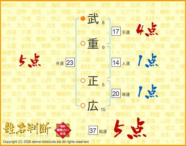 生活面を象徴する運勢です。外部から受ける影響力を表し、結婚運、家庭運や職場、環境への順応性を表します。総運から人運を引いた画数。姓や名が1文字の場合を除く。