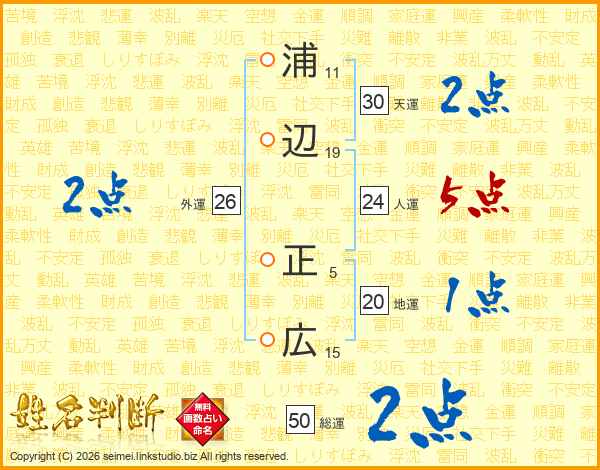 浦(11画)辺(19画) 正(5画)広(15画)