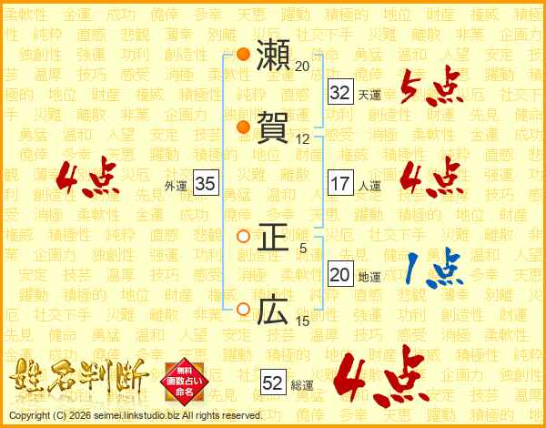 瀬賀正広さんの総運は52画の4点!