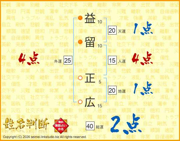生活面を象徴する運勢です。外部から受ける影響力を表し、結婚運、家庭運や職場、環境への順応性を表します。総運から人運を引いた画数。姓や名が1文字の場合を除く。