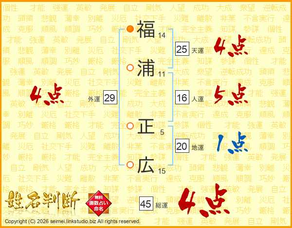 生活面を象徴する運勢です。外部から受ける影響力を表し、結婚運、家庭運や職場、環境への順応性を表します。総運から人運を引いた画数。姓や名が1文字の場合を除く。