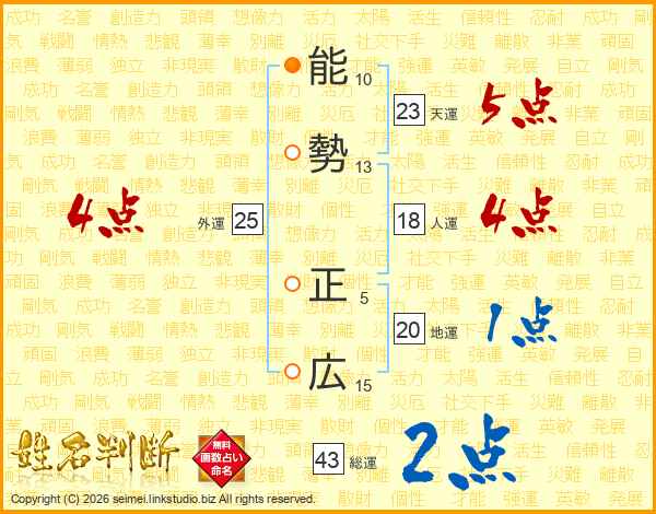 あなたの人生を表す1番重要な運勢です。生涯を通じて影響する総合運となり、主に50歳以降の晩年期に影響を及ぼします。苗字と名前の合計画数。