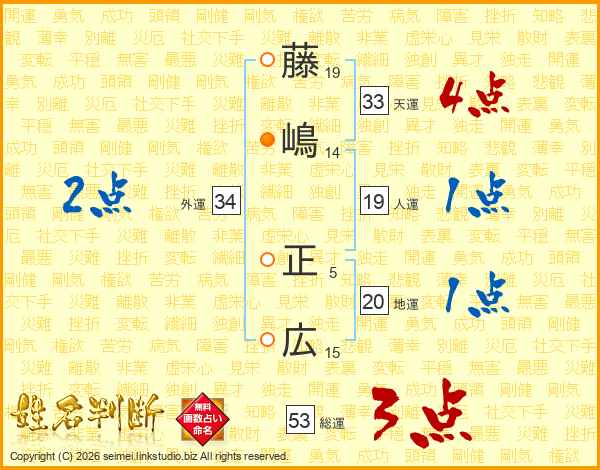 藤(19画)嶋(14画) 正(5画)広(15画)