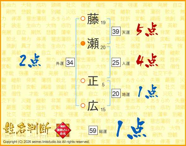 藤(19画)瀬(20画) 正(5画)広(15画)