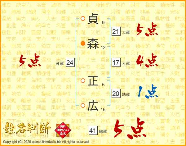 あなたの人生を表す1番重要な運勢です。生涯を通じて影響する総合運となり、主に50歳以降の晩年期に影響を及ぼします。苗字と名前の合計画数。