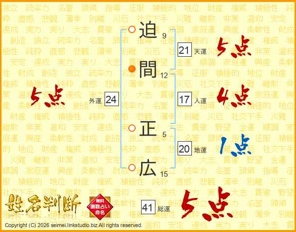 迫間正広さんの総運は41画の5点!