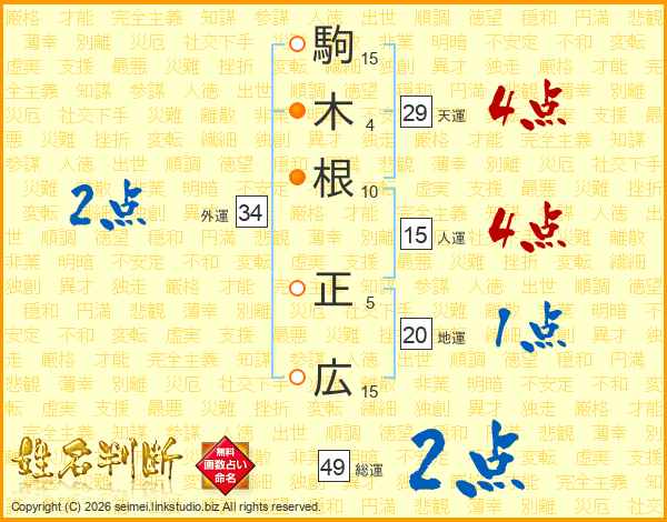 駒(15画)木(4画)根(10画) 正(5画)広(15画)