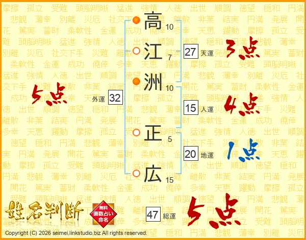 高(10画)江(7画)洲(10画) 正(5画)広(15画)