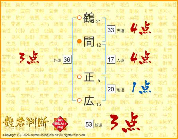 鶴(21画)間(12画) 正(5画)広(15画)