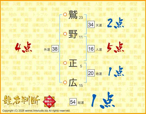 生活面を象徴する運勢です。外部から受ける影響力を表し、結婚運、家庭運や職場、環境への順応性を表します。総運から人運を引いた画数。姓や名が1文字の場合を除く。