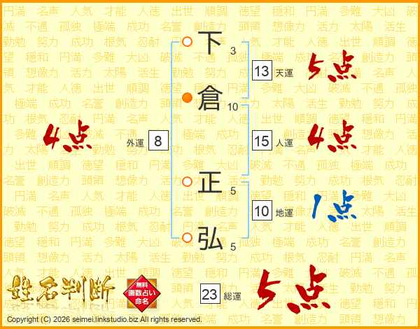 あなたの人生を表す1番重要な運勢です。生涯を通じて影響する総合運となり、主に50歳以降の晩年期に影響を及ぼします。苗字と名前の合計画数。