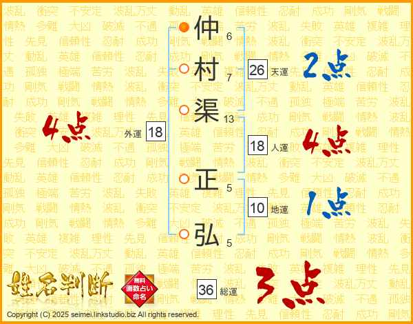 仲(6画)村(7画)渠(13画) 正(5画)弘(5画)