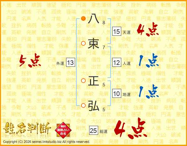生活面を象徴する運勢です。外部から受ける影響力を表し、結婚運、家庭運や職場、環境への順応性を表します。総運から人運を引いた画数。姓や名が1文字の場合を除く。
