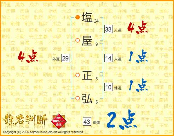 塩(24画)屋(9画) 正(5画)弘(5画)