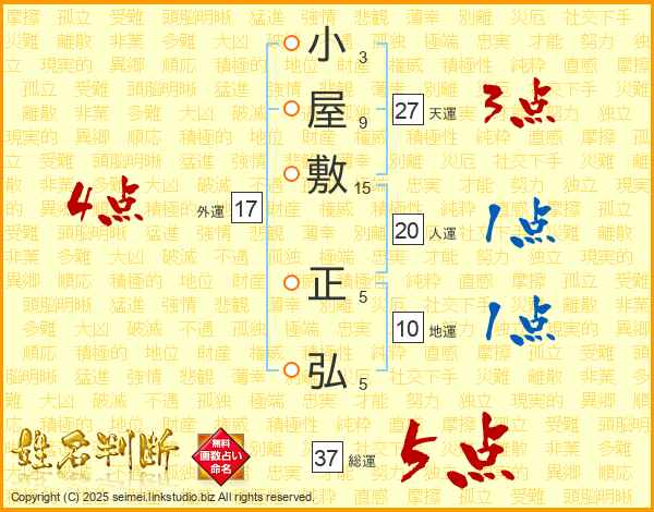 小(3画)屋(9画)敷(15画) 正(5画)弘(5画)