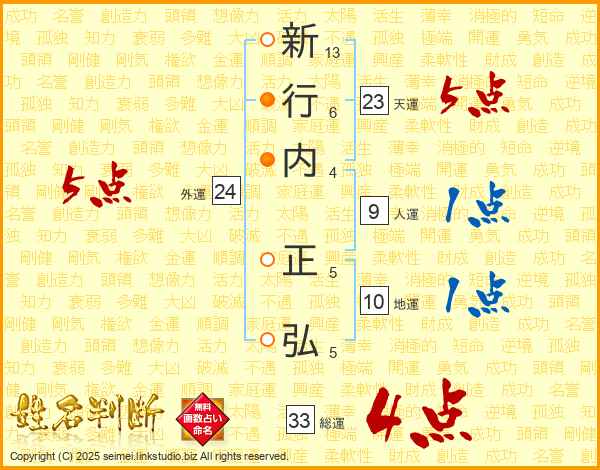 生活面を象徴する運勢です。外部から受ける影響力を表し、結婚運、家庭運や職場、環境への順応性を表します。総運から人運を引いた画数。姓や名が1文字の場合を除く。