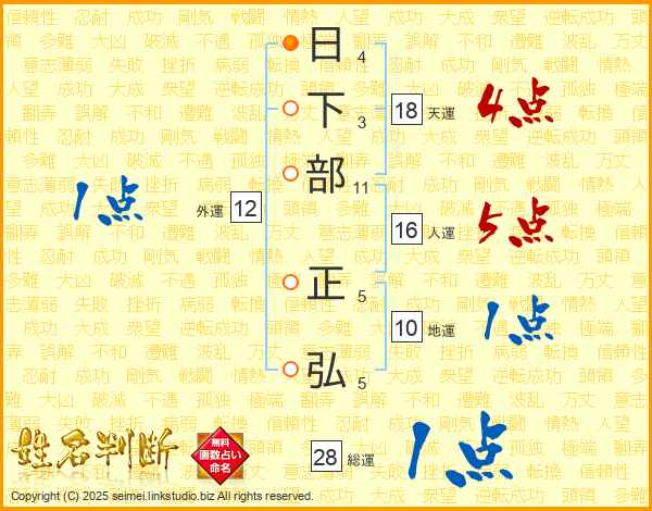 日(4画)下(3画)部(11画) 正(5画)弘(5画)