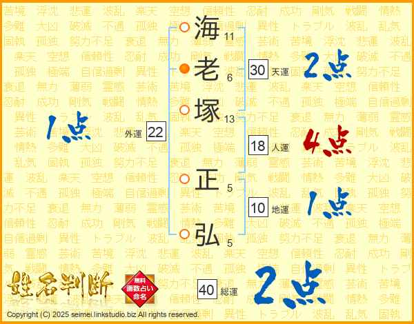 海(11画)老(6画)塚(13画) 正(5画)弘(5画)