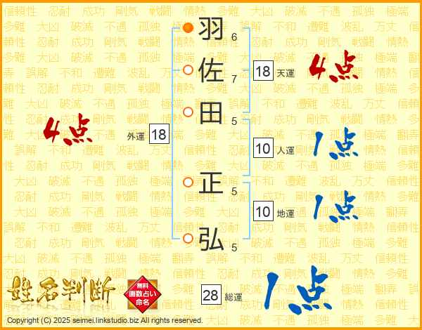 羽(6画)佐(7画)田(5画) 正(5画)弘(5画)