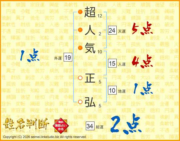 超(12画)人(2画)気(10画) 正(5画)弘(5画)