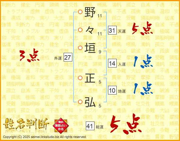 野(11画)々(11画)垣(9画) 正(5画)弘(5画)