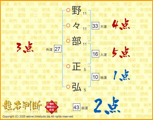 野(11画)々(11画)部(11画) 正(5画)弘(5画)