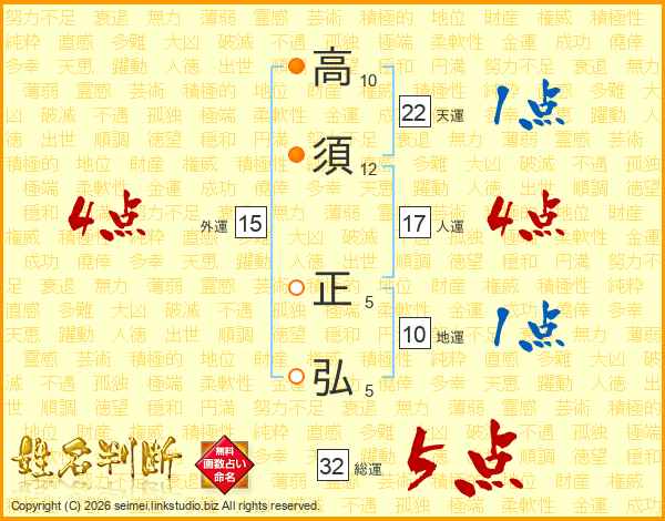 あなたの人生を表す1番重要な運勢です。生涯を通じて影響する総合運となり、主に50歳以降の晩年期に影響を及ぼします。苗字と名前の合計画数。
