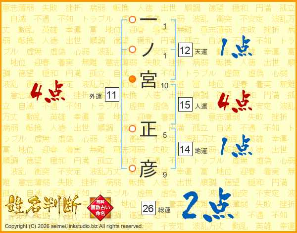 一(1画)ノ(1画)宮(10画) 正(5画)彦(9画)