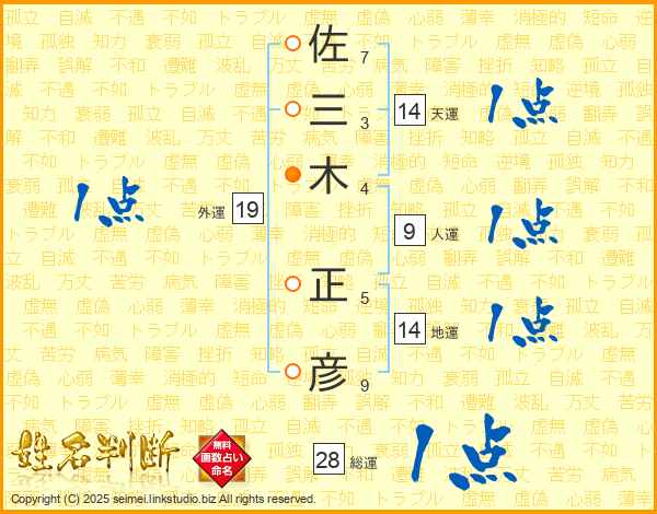 佐(7画)三(3画)木(4画) 正(5画)彦(9画)