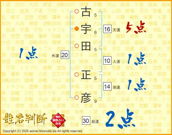 古(5画)宇(6画)田(5画) 正(5画)彦(9画)