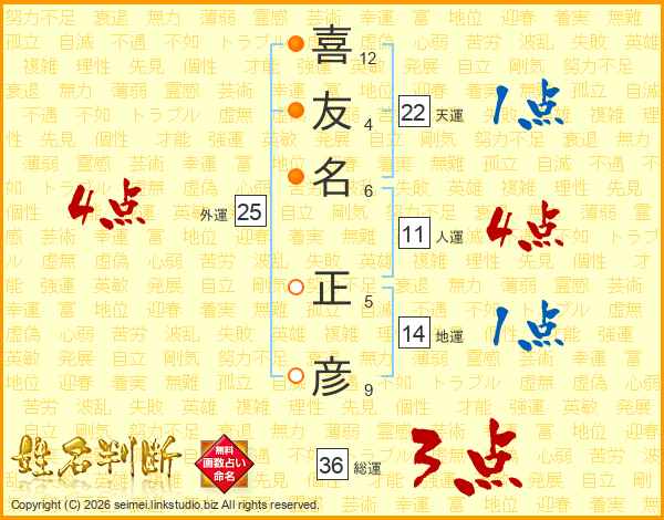 喜(12画)友(4画)名(6画) 正(5画)彦(9画)