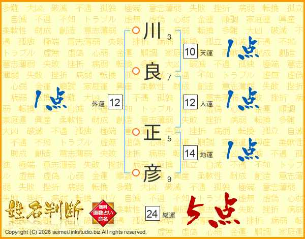 川(3画)良(7画) 正(5画)彦(9画)