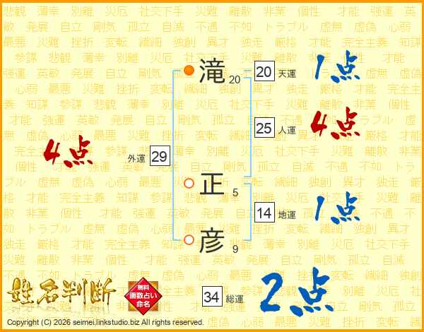 あなたの人生を表す1番重要な運勢です。生涯を通じて影響する総合運となり、主に50歳以降の晩年期に影響を及ぼします。苗字と名前の合計画数。