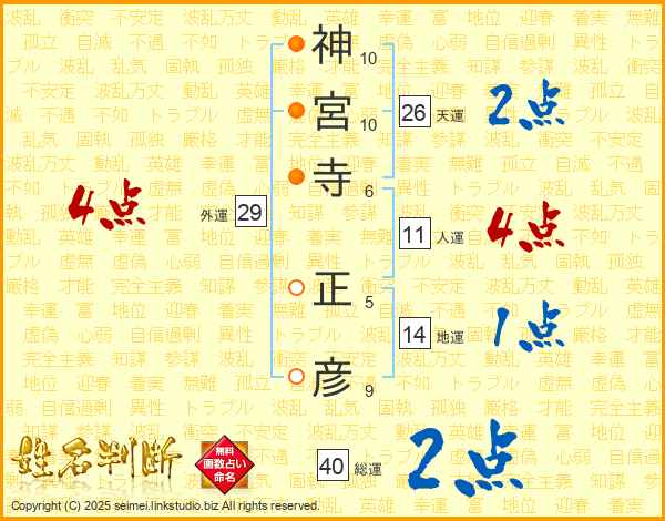 神(10画)宮(10画)寺(6画) 正(5画)彦(9画)
