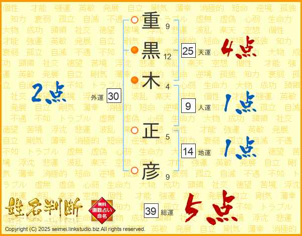 重(9画)黒(12画)木(4画) 正(5画)彦(9画)