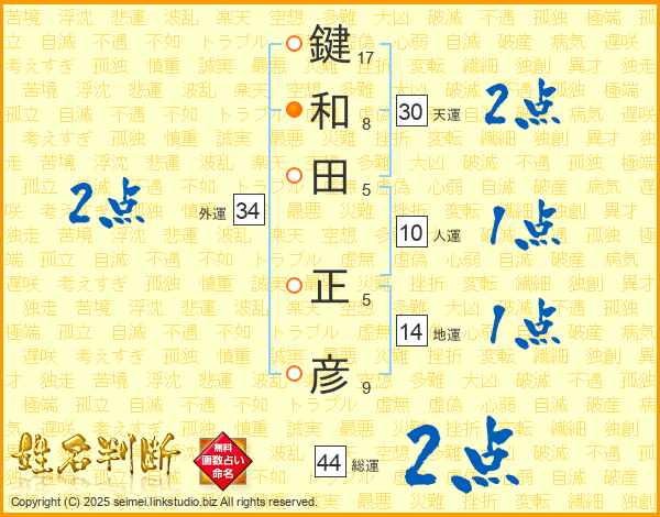 鍵(17画)和(8画)田(5画) 正(5画)彦(9画)