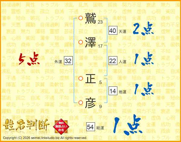 鷲(23画)澤(17画) 正(5画)彦(9画)