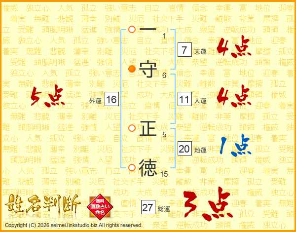 生活面を象徴する運勢です。外部から受ける影響力を表し、結婚運、家庭運や職場、環境への順応性を表します。総運から人運を引いた画数。姓や名が1文字の場合を除く。