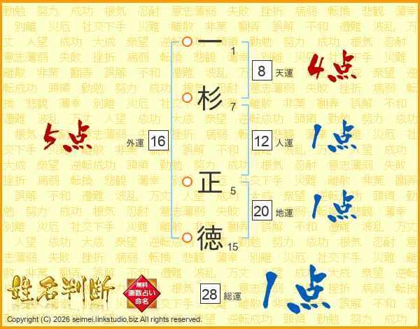 あなたの人生を表す1番重要な運勢です。生涯を通じて影響する総合運となり、主に50歳以降の晩年期に影響を及ぼします。苗字と名前の合計画数。