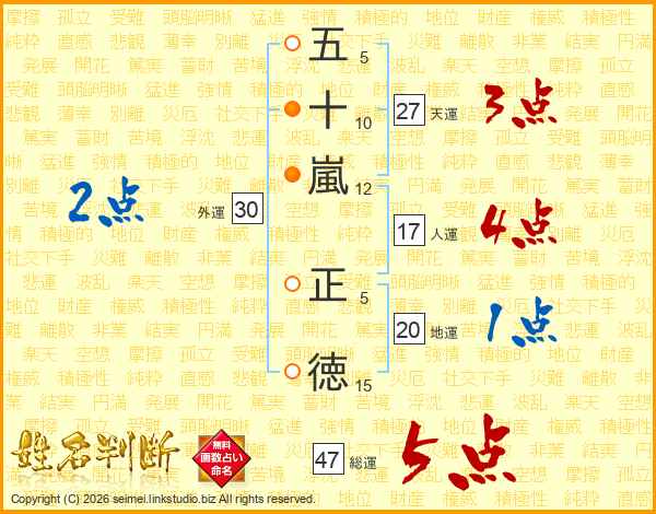 五(5画)十(10画)嵐(12画) 正(5画)徳(15画)