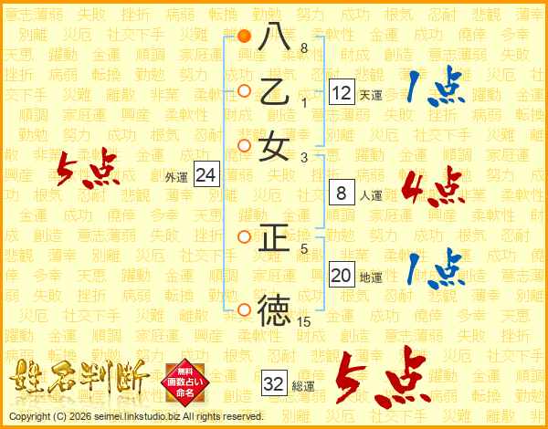 八(8画)乙(1画)女(3画) 正(5画)徳(15画)