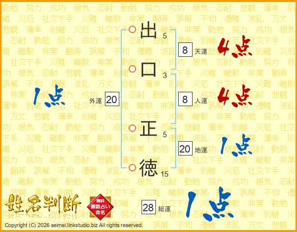 生活面を象徴する運勢です。外部から受ける影響力を表し、結婚運、家庭運や職場、環境への順応性を表します。総運から人運を引いた画数。姓や名が1文字の場合を除く。