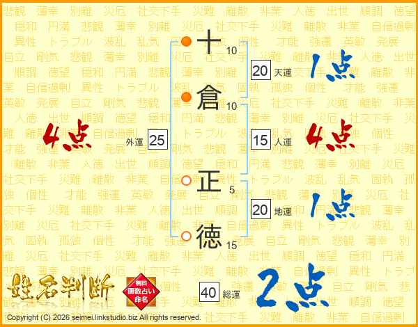 生活面を象徴する運勢です。外部から受ける影響力を表し、結婚運、家庭運や職場、環境への順応性を表します。総運から人運を引いた画数。姓や名が1文字の場合を除く。
