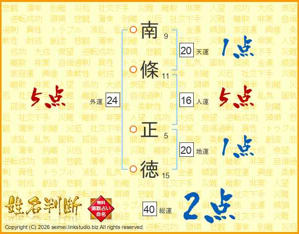 生活面を象徴する運勢です。外部から受ける影響力を表し、結婚運、家庭運や職場、環境への順応性を表します。総運から人運を引いた画数。姓や名が1文字の場合を除く。